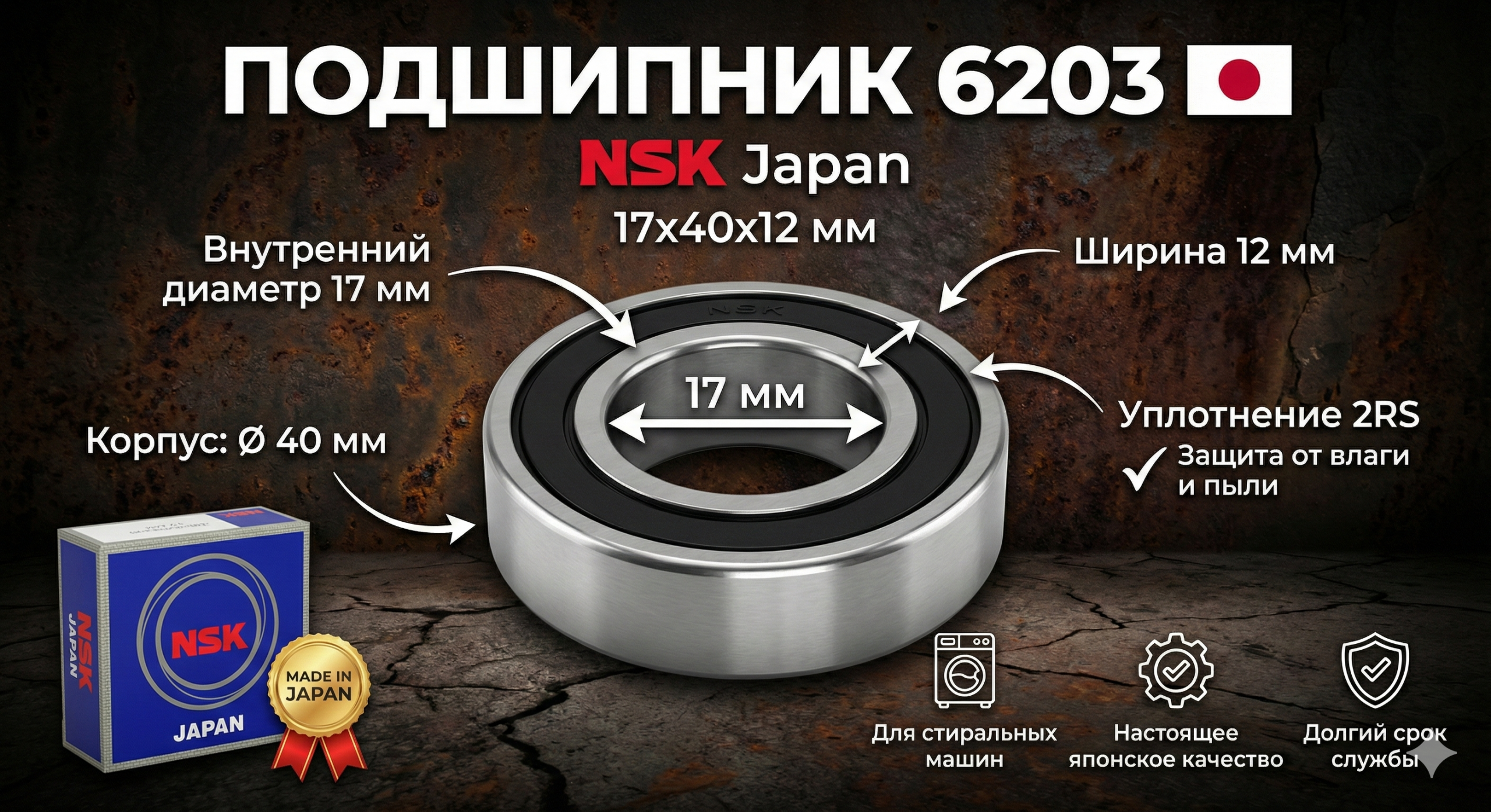 Подшипник 6203 NSK (17x40x12 мм) для стиральной машины – Japan